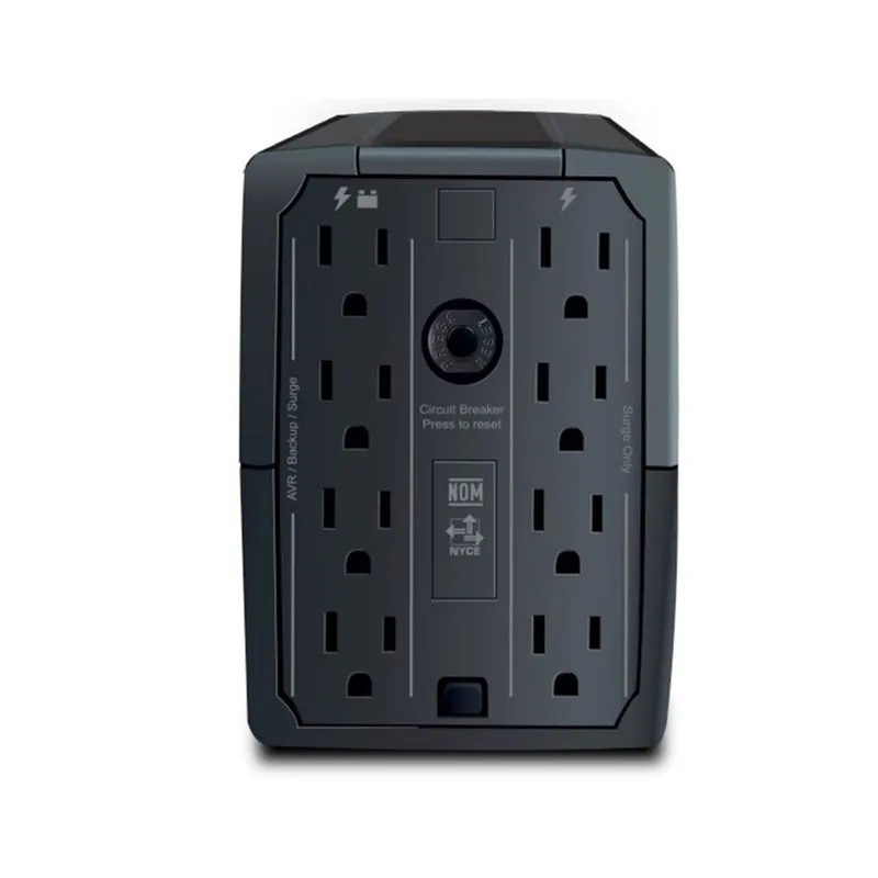UPS interactivo de línea de 1000VA con 8 toma corrientes NEMA 5-15 diseñados para el hogar / oficina. Baterías de plomo Acido selladas internas, regulador de voltaje supresor de sobre tensiones y salidas de derivación para cargas más grandes. Proporciona energía continua a enrutadores WIFI, sistemas de alarma y equipos informáticos. Las alarmas audibles indican el funcionamiento y los niveles de batería. Certificado por las agencias reguladoras NOM, ISO9001-2015, ISO14001, RETIE.